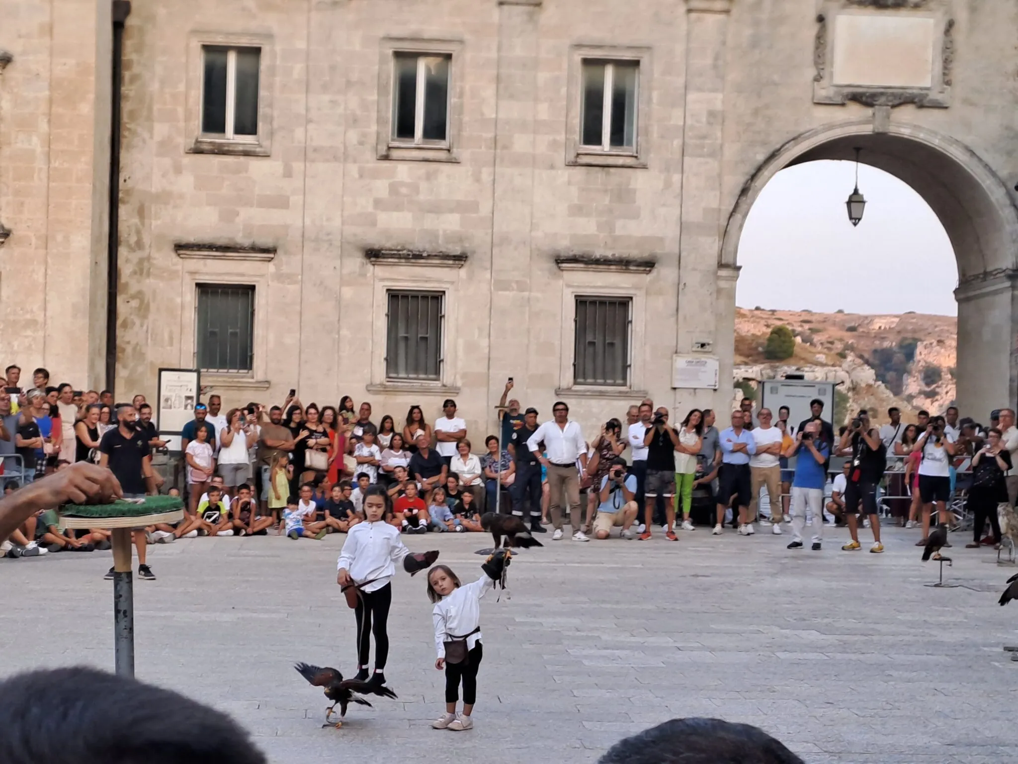 Le poiane di Harris, il falco pellegrino, gli avvoltoi, il gufo europeo e una coppia di aquile americane: sono stati loro le guest star venerdì scorso in una piazza San Pietro Caveoso gremita per uno spettacolo unico nel suo genere. La falconeria, con tutte le sue suggestioni e i suoi echi medievali, fiore all’occhiello del Parco della Grancia a Brindisi di Montagna, ha fatto eccezionalmente tappa nel cuore degli antichi rioni di Matera.
