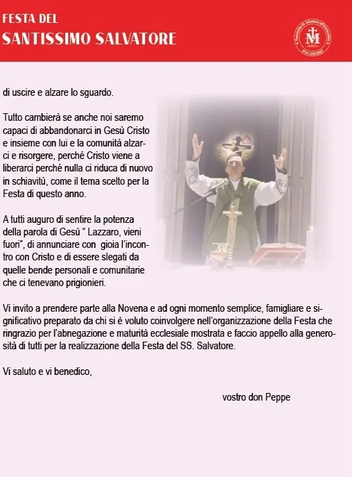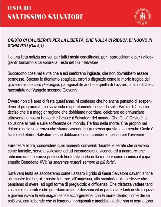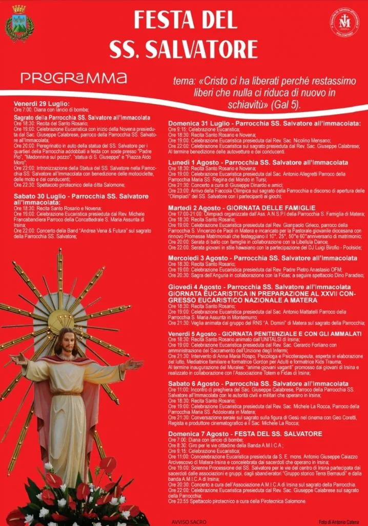 Sul tema: "Cristo ci ha liberati perchè restassimo liberi che nulla ci riduca di nuovo in schiavitù" (Gal. 5), ritorna la Festa del SS Salvatore di Irsina, organizzata dall'omonima Parrocchia che ha messo a punto un ricco programma comprendente la Novena, attività liturgico-pastorali, culturali e musicali coinvolgendo nell'animazione giovani, famiglie e l'intera comunità irsinese. Vari sono gli ospiti coinvolti nelle varie serate. Inizio venerdì 29 luglio, giornata conclusiva domenica 7 agosto con la concelebrazione eucaristica in mattinata presieduta dall'arcivescovo mons. Antonio Giuseppe Caiazzo insieme a tutto il clero di Irsina. In serata conclusione con la processione attraverso le vie della città con i sacerdoti, le associazioni e i gruppi ecclesiali, gli sbandieratori e la banda musicale. Infine a mezzanotte spettacolo pirotecnico,