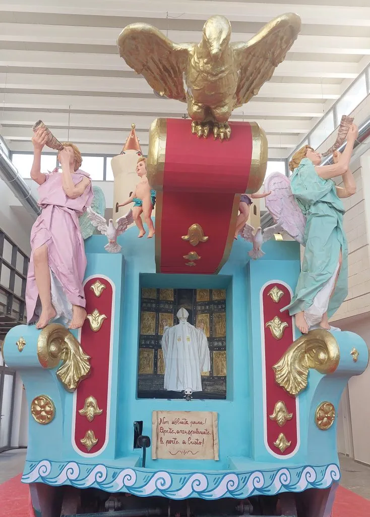 Cosa buona è giungere preparati nella fabbrica del carro per poter cogliere la profondità dei tanti messaggi che trasmette questa bellissima opera d’arte che – davvero che peccato! – purtroppo vivrà solo per altri nove giorni.