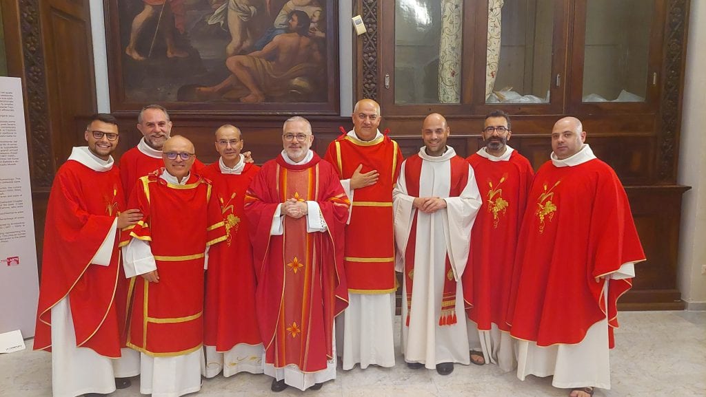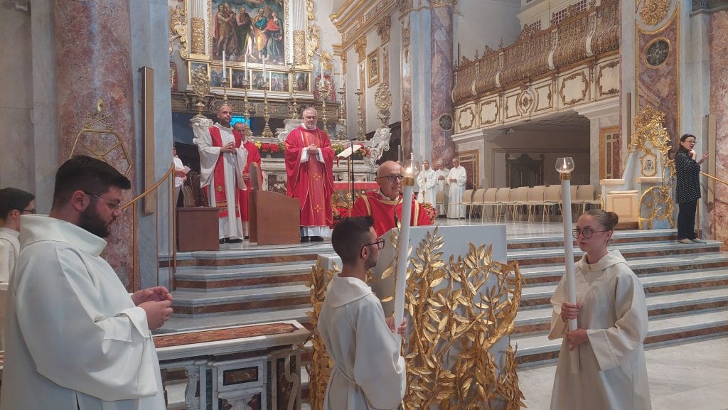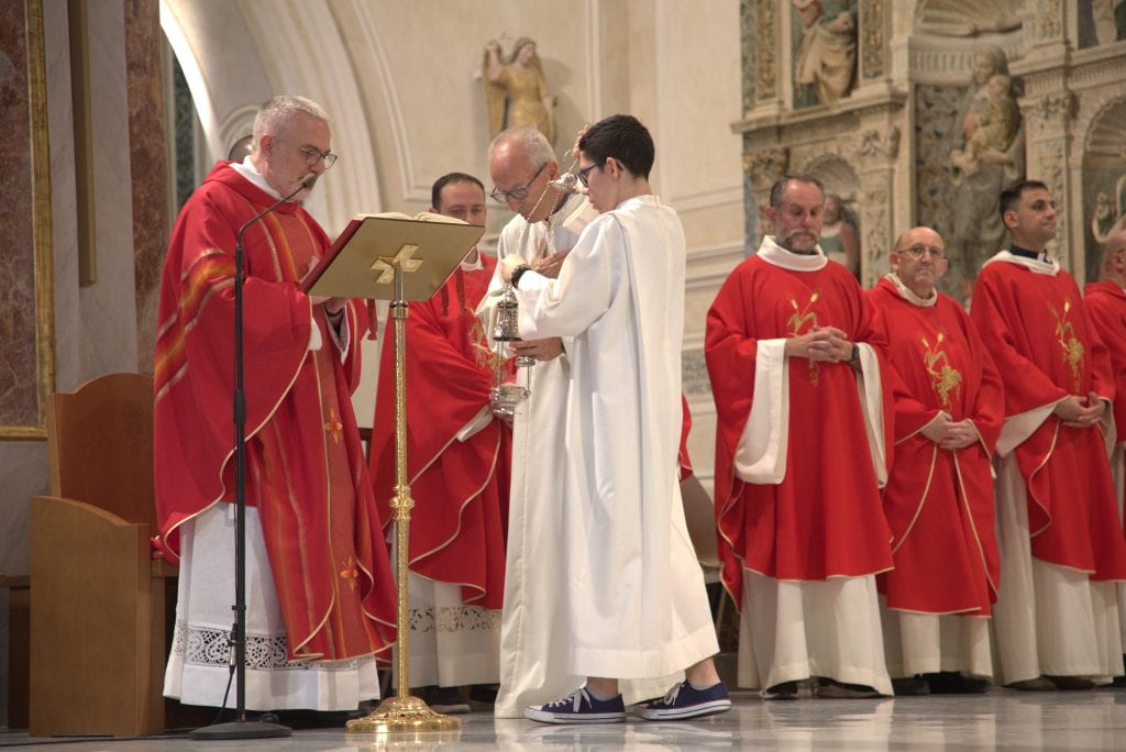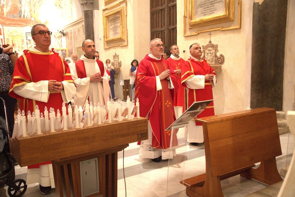 Presente al completo nella prima serata l’Associazione Disma – così chiamata come il “buon ladrone” – dei volontari che operano nella Casa Circondariale di Matera; e con loro ci sono due reclusi in permesso premio. Tutti insieme, costoro hanno festosamente animato la liturgia, sostenuti dal suono delle chitarre di fra Gianparide Nappi, cappellano del carcere e assistente spirituale dell’Associazione, e di Gabriele Ziino e dalle percussioni di Uccio Santochirico. Ma ci sono anche gli ospiti della “Casa dei Giovani” nonché gli ipovedenti e i sordomuti, così sulle scale del presbiterio c’è una traduttrice LIS per tutta la liturgia. Il rosso dei fiori che adornano il presbiterio fa pendant con le casule rosse come il sangue dei martiri che oggi si festeggiano.