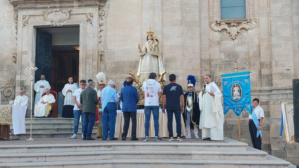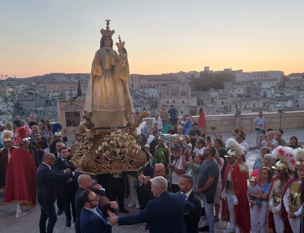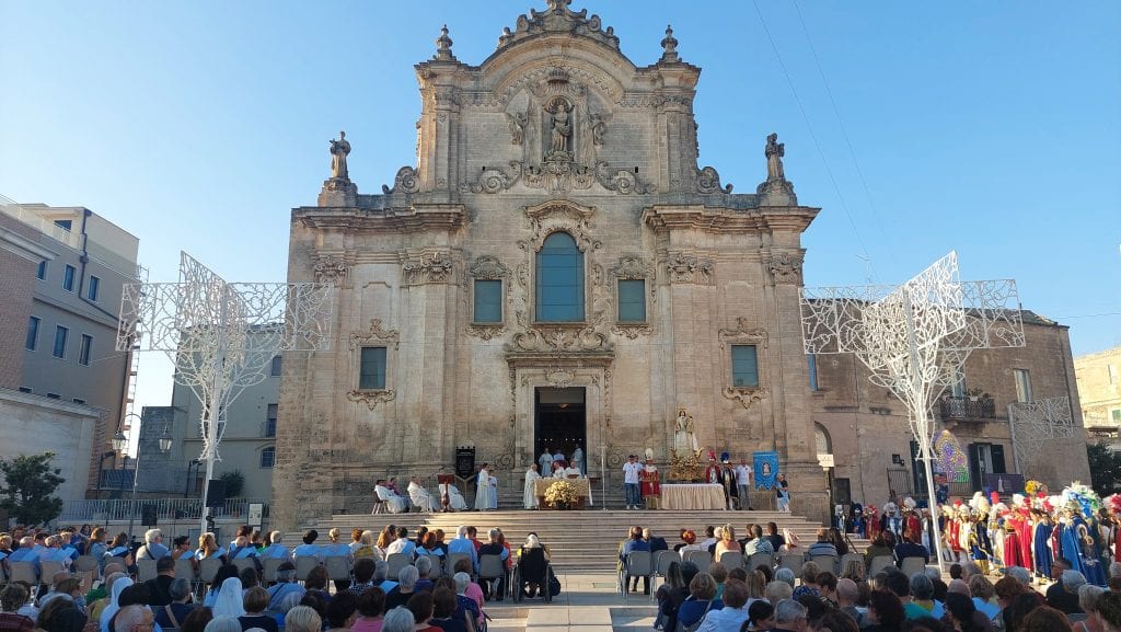 Prima la preghiera del Rosario, poi la Celebrazione Eucaristica presieduta da don Angelo Gioia, Amministratore Diocesano, concelebrata dai sacerdoti del Capitolo Cattedrale e animata da diversi ministranti. I cavalieri della Bruna, con la varietà dei colori dei loro abiti, fanno da corona al popolo di Dio dal lato destro della piazza, il coro polifonico dei “Cantori Materani” dall’altro lato fa sentire la sua voce e si fa notare con le magliette azzurre.