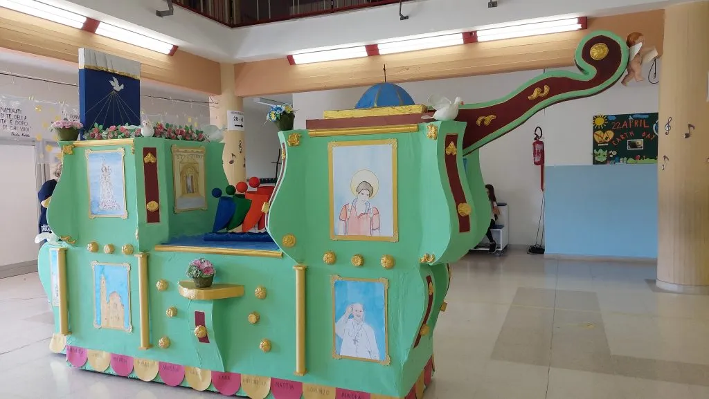 Dopo quel momento, i fanciulli hanno continuato a realizzare, a scuola, compatibilmente con gli impegni scolastici, nelle ore di “Arte e Immagine”, tutti gli elementi decorativi in carta e cartapesta e i disegni dipinti ad acquerello, poi posti sul Carro: un Carro in miniatura lungo circa tre metri!