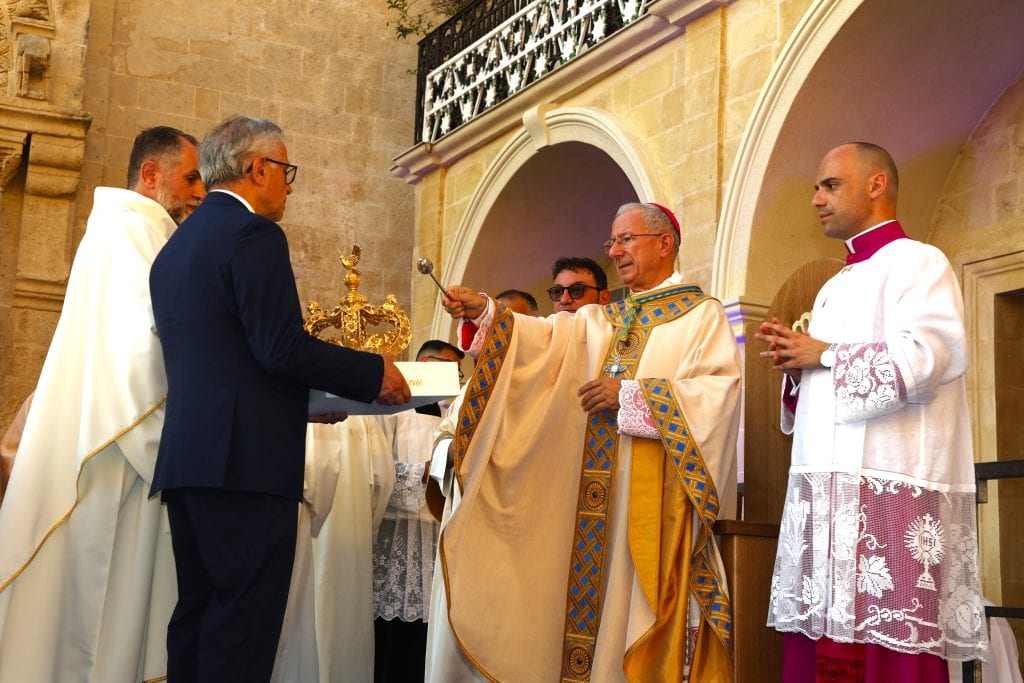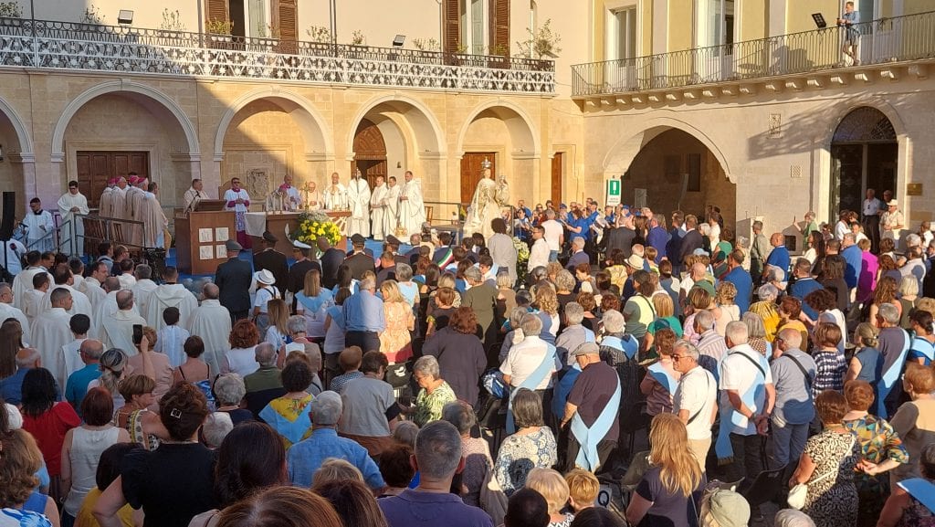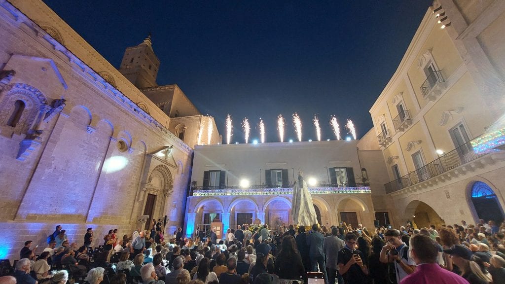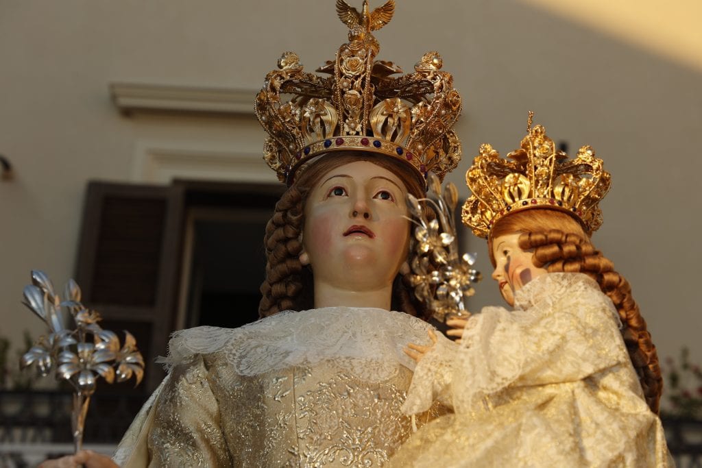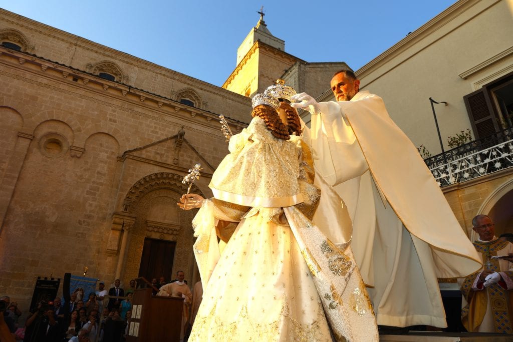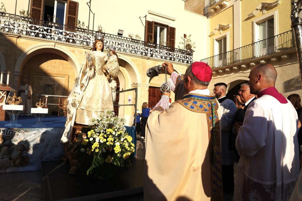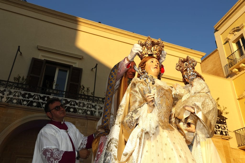 Al termine della celebrazione uno spettacolo di fuochi d’artificio sul terrazzo dell’episcopio e luci per Piazza Duomo, per il popolo che ha donato le corone e che riconosce Maria come madre, ma anche per Maria: ecco che la statua è stata ruotata perché anche lei virtualmente guardasse lo spettacolo. E l’effige della Madonna è stata posta nella chiesetta di San Giuseppe, in via Riscatto, dove verrà prelevata domani dopo il pontificale.