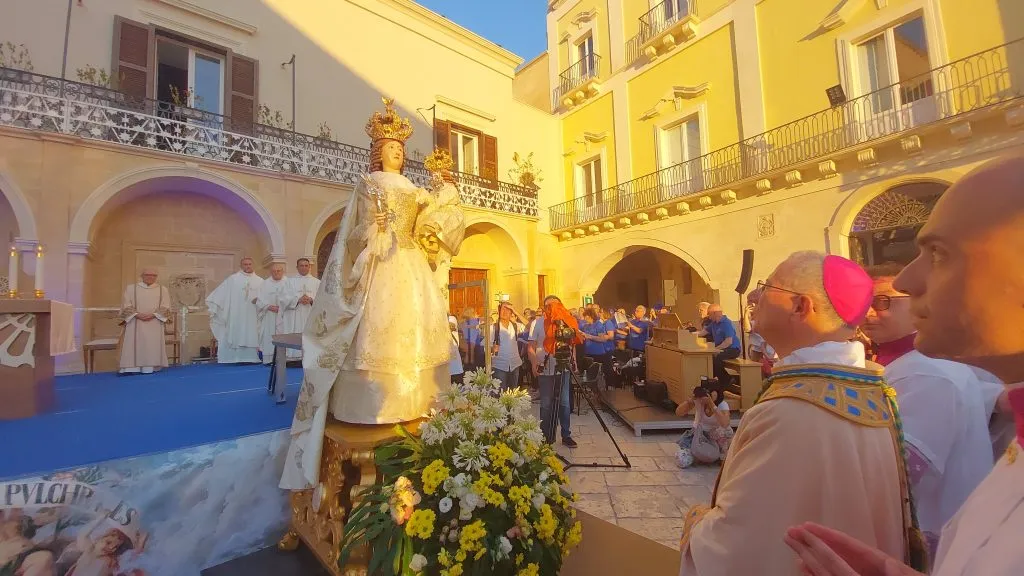 “Le vieni incontro con larghe benedizioni, le poni sul capo una corona d’oro fino” (Sal 21,4) è stato lo slogan associato al progetto, e così è stato la sera del primo luglio nella gremitissima Piazza Duomo dove mons. Antonio G. Caiazzo, vescovo di Cesena-Sarsina e già arcivescovo di Matera-Irsina, che ha creduto fermamente nel progetto dell’incoronazione di Maria in questo anno giubilare, ha posto le due nuove bellissime corone sul capo di Maria e di Gesù Bambino.