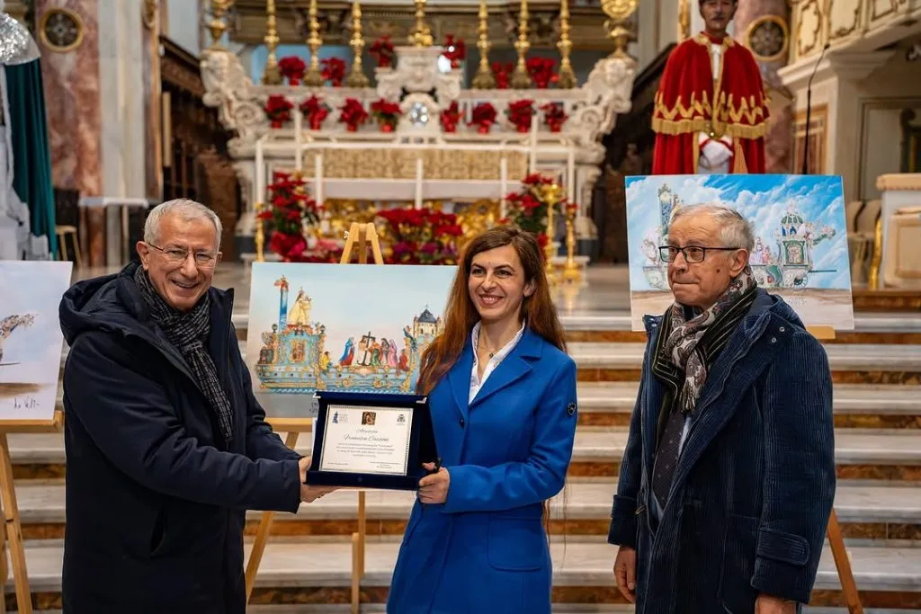 Quindi, il dott. Fabrizio Perrone, storico dell’arte, il più giovane della commissione giudicatrice dei bozzetti, che, rivolgendosi a Francesca, ha rievocato i nomi illustri di coloro che l’hanno preceduta: i fratelli Conversi – Vito Antonio, grandissimo pittore di cui abbiamo diverse opere nelle chiese sia di Matera sia del circondario –, Nunzio Nicola Bonamassa, costruttore del carro dal 1777 al 1810, con una sola interruzione, nel 1804, perché impegnato a Miglionico, e, infine, Francesco Saverio D’Antona, autore anche degli stucchi e delle dorature della cattedrale. E sottolinea ancora che, come ha appreso da Foschino, il carro non sempre è stato distrutto ogni anno.