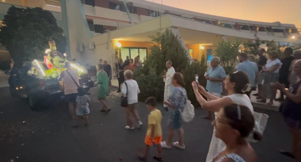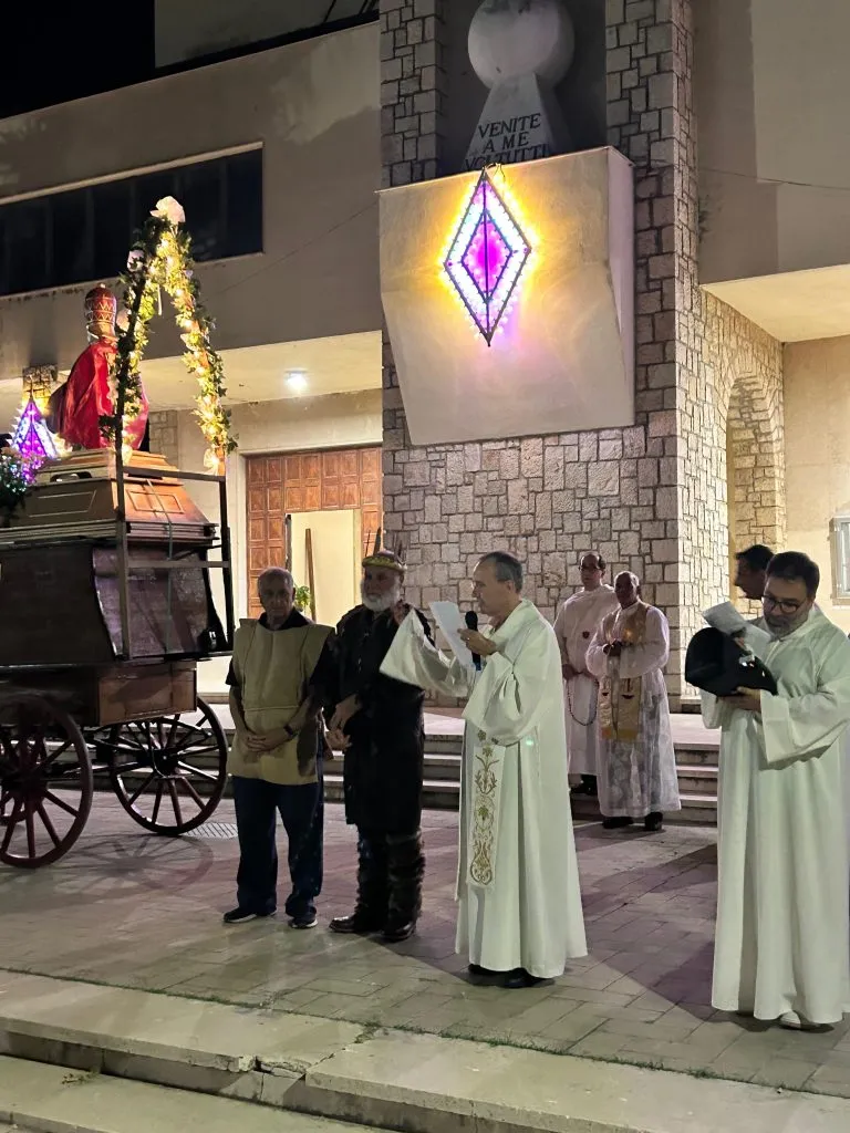 Alla conclusione della Messa, rispettando il programma dei festeggiamenti, viene issata la statua di San Leone sulla tradizionale carrozzella per procedere in processione per le strade del Borgo. Il corteo si è formato con la croce processionale all’inizio, attorniata dai ministranti, a seguire don Angelo che al microfono scandiva i tempi del rosario e di altre letture sigificative quale ad esempio la dichiarazione del Patriarca Latino di Gerusalemme il card. Pierbattista Pizzaballa che nei giorni scorsi si è recato a Gaza, insieme al Patriarca ordotosso greco Teofilo III, dopo il bombardamento israeliano della chiesa cattolica della Sacra Famiglia. Don Angelo ha riferito quanto, tra l’altro, ha detto Pizzaballa: “Cristo non è assente da Gaza”. “È lì crocifisso, tra i feriti, sepolto sotto le macerie, e presente in ogni atto di misericordia, una candela nel buio, ogni mano protesa verso il sofferente”.