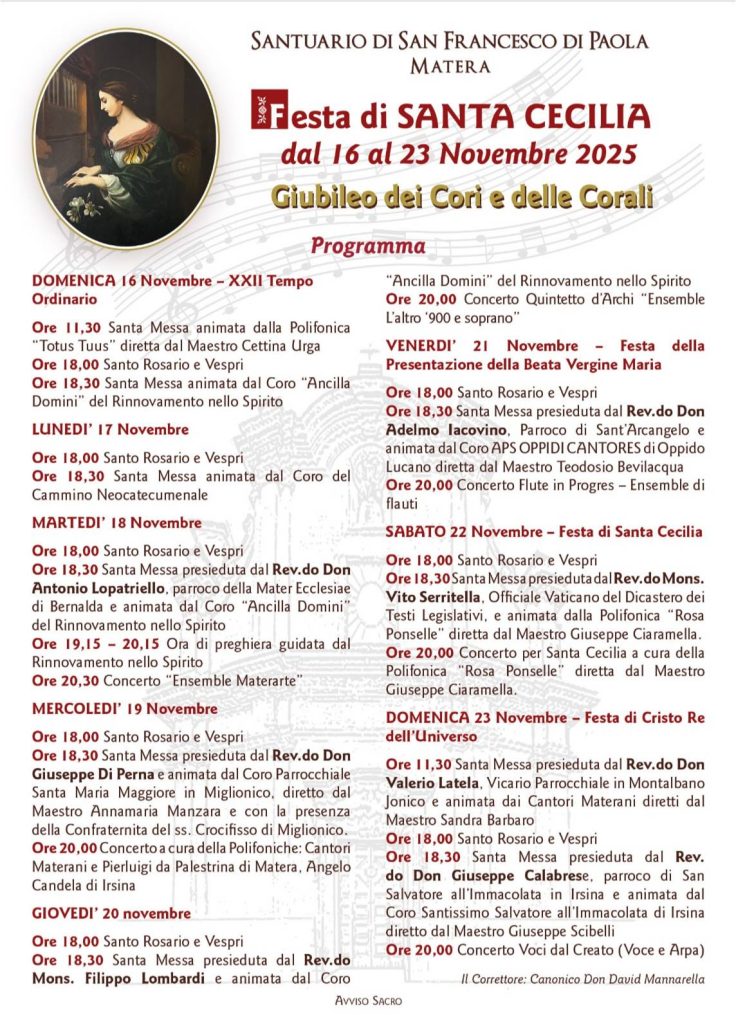 In occasione della Festa di Santa Cecilia, quest’anno – presso il Santuario di San Francesco di Paola a Matera – si terrà la manifestazione del “Giubileo dei cori e delle corali”, che ha la particolarità di essere l’edizione giubilare e quindi con tante formazioni canore che animeranno le celebrazioni e allieteranno i convenuti.