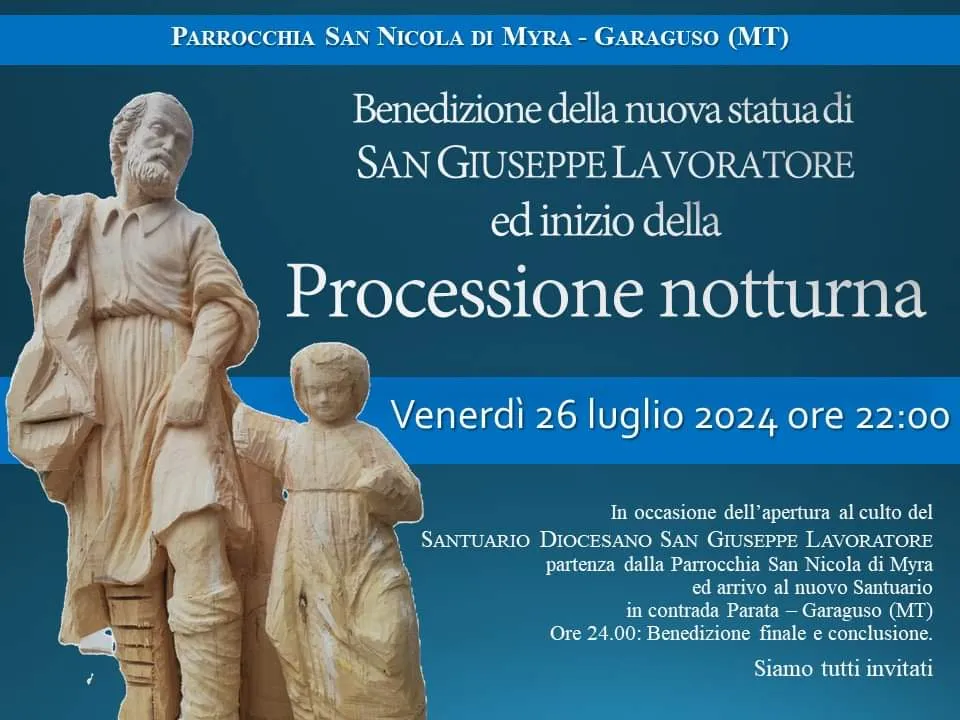 La nuova apertura del Santuario sarà preceduta da una processione notturna il giorno precedente, 26 luglio dalle ore 22:00, con la benedizione della nuova statua, appositamente realizzata in legno ed offerta dalla sig.ra Maria Cerabona. Dalla chiesa madre di Garaguso si procederà a piedi fino al Santuario, in contrada Parata, come primo pellegrinaggio da parte dei fedeli che accompagneranno l’effige di San Giuseppe Lavoratore, un pezzo unico nel suo genere realizzato da uno scultore del leccese.
