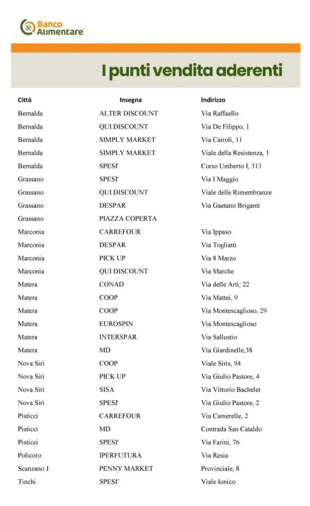 Sono 29 i supermercati che hanno aderito all’iniziativa distribuiti nei comuni di Matera, Bernalda, Grassano, Nova Siri, Pisticci (con Tinchi e Marconia), Policoro e Scanzano Jonico.