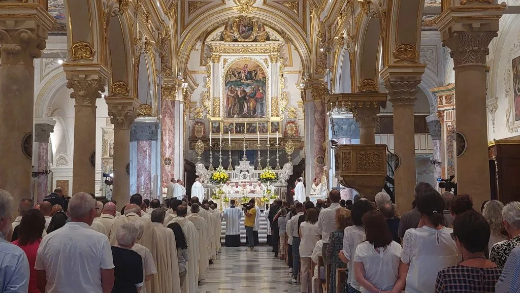 Una celebrazione solenne, animata da una cinquantina di cantori del coro diocesano “Signum Magnum” – diretto dal m° don Vito Burdo, con Martina Tosti all’organo – che ha radunato in Piazza Duomo 800 fedeli e in Cattedrale 100 sacerdoti, una ventina tra rappresentanti degli Enti Locali e sindaci della Diocesi, le religiose e gli ospiti romani: tra tutti, in particolare, il gruppo della Caritas Romana di cui don Ben è stato direttore (2018-2021).