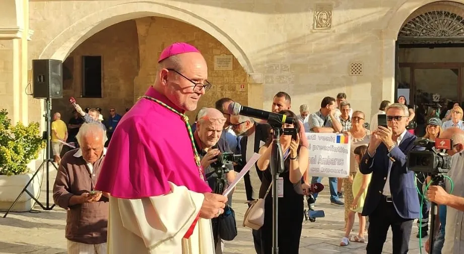 A Roma mi presentavo come romeno romano, e poi col passare del tempo, sempre più romano che romeno… Ma ora, chi sono io? I Santi Patroni della nostra Arcidiocesi, a cui affido il mio ministero episcopale, sono Maria Ss.ma della Bruna, S. Giovanni da Matera, S. Eufemia e s. Eustachio. Quest’ultimo, generale romano, si è distinto anche nelle guerre di conquista dei miei antenati nella… Dacia, l’attuale Romania. Oggi è arrivato il loro pronipote, eh! Arrivato carico di gratitudine per la vostra accoglienza; e non per conquistare ma per servire, con la fiducia che Popolo e Pastore possano condividere insieme i doni divini, ed edificare il Regno di Dio in questo nostro mondo, così bisognoso di vedere semi di pace, di riconciliazione e di amore autentico.