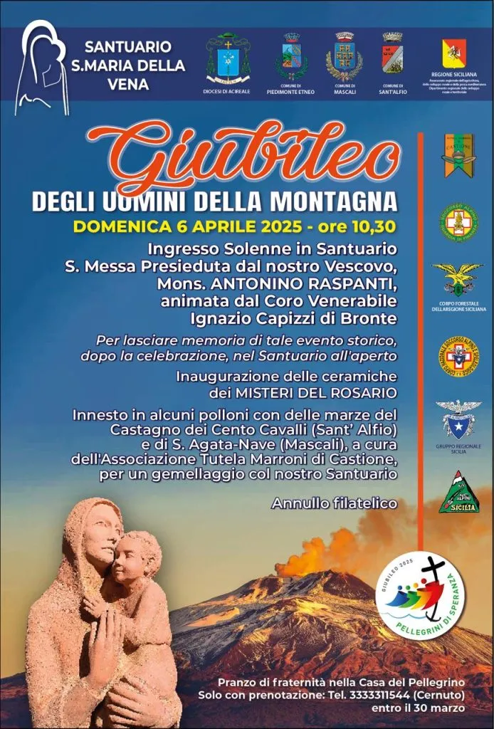 Il giorno 6 aprile 2025 sull’Etna, presso il Santuario Santa Maria della Vena di Piedimonte Etneo, che fa parte della Diocesi di Acireale, sarà dedicata una giornata al GIUBILEO DEGLI UOMINI DELLA MONTAGNA, dedicato a chi la montagna la vive e a chi in essa lavora, spesso con eroismo. Sono previsti I seguenti momenti: la S. Messa presieduta dal Vescovo della Diocesi di Acireale, monsignor Antonino Raspanti, celebrazione che sarà animata dal coro Venerabile Ignazio Capizzi di Bronte; l’inaugurazione delle ceramiche dei misteri del Rosario, che lascerà memoria dell’evento nel santuario all’aperto; l’annullo filatelico sull’evento, che interesserà in modo particolare i collezionisti; gli innesti con delle marze dei due patriarchi dell’Etna (Castagno dei Cento Cavalli di Sant’Alfio e Castagno Sant’Agata “della Nave” di Mascali) su dei polloni di castagno già presenti presso il boschetto Santa Silvia, che insiste nel terreno dello stesso Santuario.