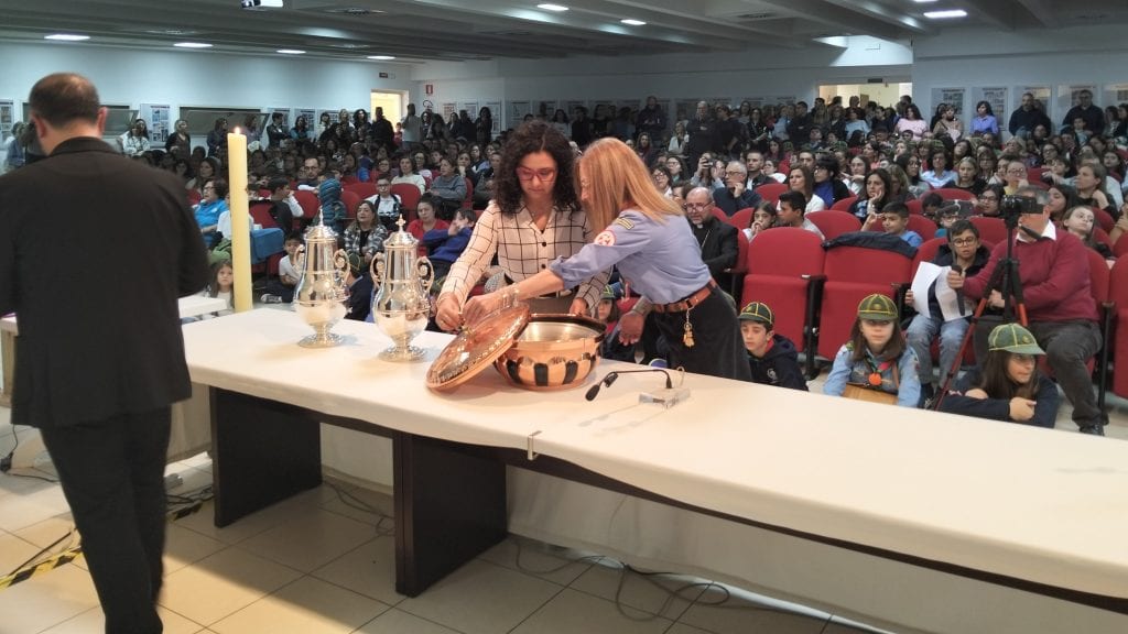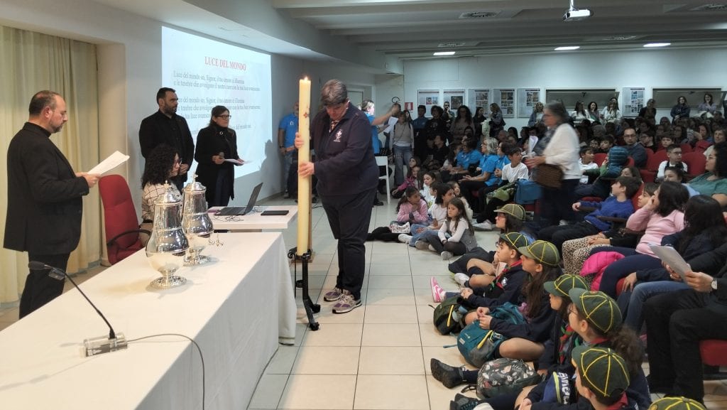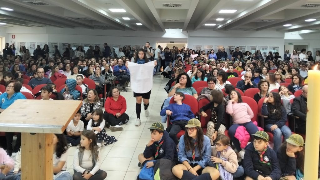 Spiccano nel salone di Casa Sant’Anna le camicie azzurre degli scout e in particolare i cappellini verdi di lupetti e coccinelle: anche il cammino AGESCI è riconosciuto come una modalità di iniziazione alla vita cristiana.