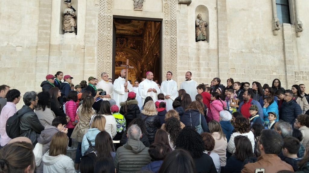 Le scale del portone centrale della cattedrale sono il punto di ritrovo di vescovo, famiglie ed educatori. E seppure in questo anno giubilare porte sante non sono che a Roma, l’invito del vescovo al popolo di Dio lì riunito è quello di vivere questo momento varcando in modo particolare l’ingresso della cattedrale, ad esempio con le “mani in alto”, per dire: “Mi arrendo al tuo amore, Signore”.