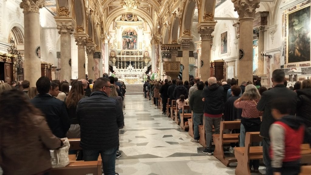 E tutti, dietro la croce che reca il vescovo, al suono delle campane, tutti entrano e gremiscono all’inverosimile la cattedrale.