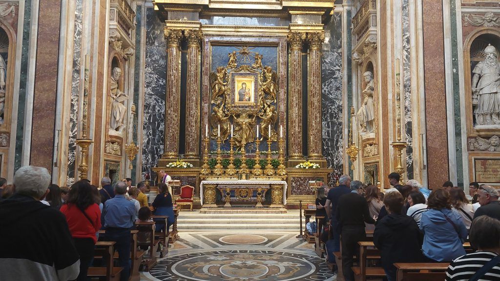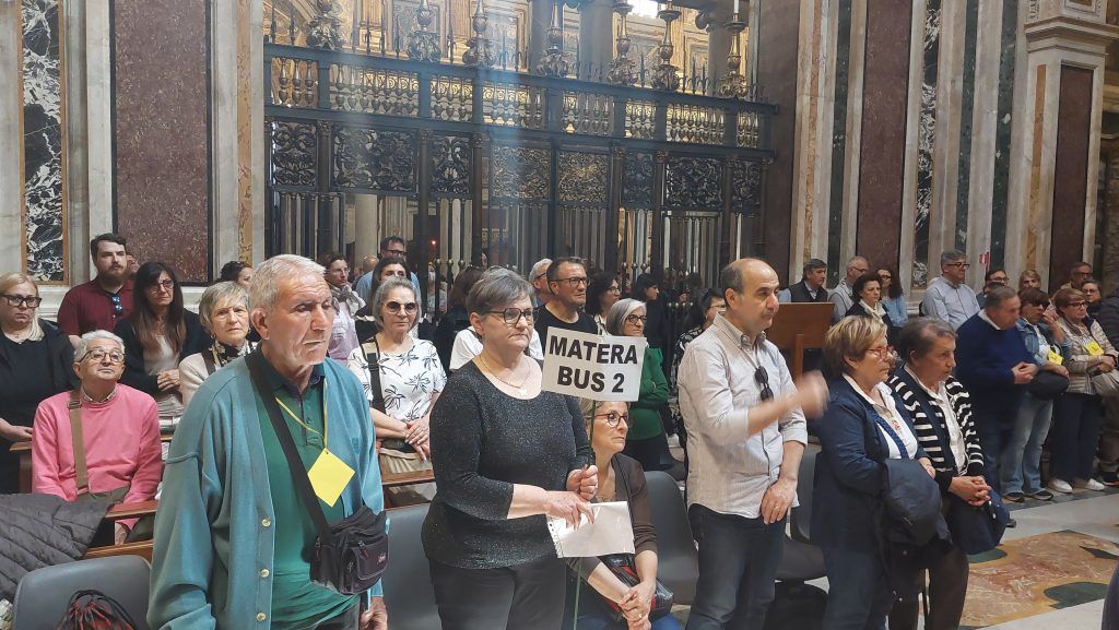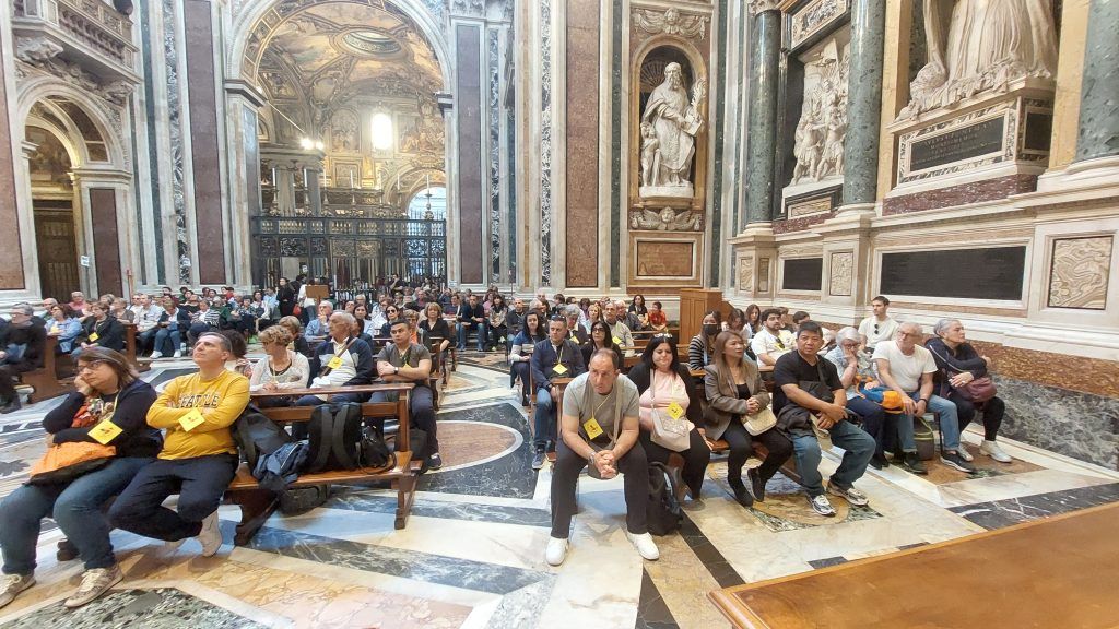 Nel pomeriggio libero, chi non l’ha fatto prima, ha visitato la Basilica, soffermandosi nella bella Cappella Sistina, omonima di quella che è in Vaticano, con il suo immenso e stupendo tabernacolo, e nella cripta sottostante l’altare, dove vi è una reliquia della mangiatoia di Betlemme. Alcuni, poi, si sono mossi per le strade di Roma, sempre bella seppur vista e rivista, soprattutto accompagnati dal bel tempo primaverile che ha fatto da cornice a tutto il pellegrinaggio; altri si sono allungati a S. Giovanni, dov’era in atto il “Concertone” del Primo Maggio; altri ancora sono arrivati a S. Paolo Fuori le Mura, un extra rispetto al programma diocesano che ha consentito loro di visitare tutte le Basiliche Maggiori, varcando così quattro Porte Sante. E i pellegrini di Marconia, invece, al mattino, arrivando molto presto, hanno fatto tappa ad un altro luogo della devozione romana, il Santuario del Divino Amore.