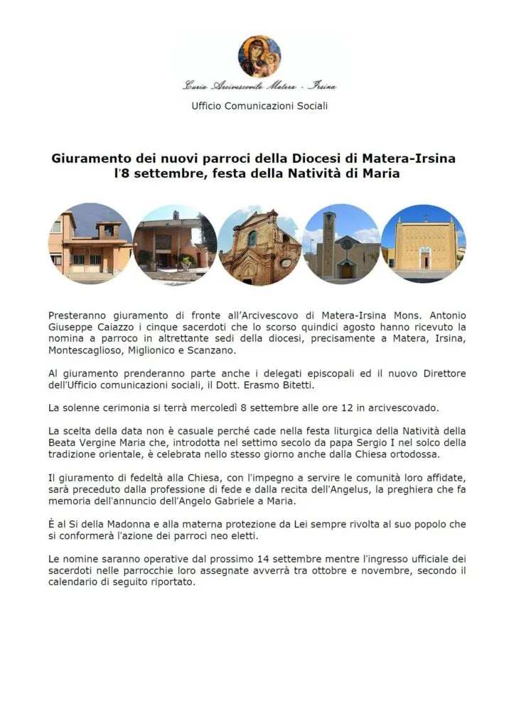 Presteranno giuramento di fronte all’Arcivescovo di Matera-Irsina Mons. Antonio Giuseppe Caiazzo i cinque sacerdoti che lo scorso quindici agosto hanno ricevuto la nomina a parroco in altrettante sedi della diocesi, precisamente a Matera, Irsina, Montescaglioso, Miglionico e Scanzano J.