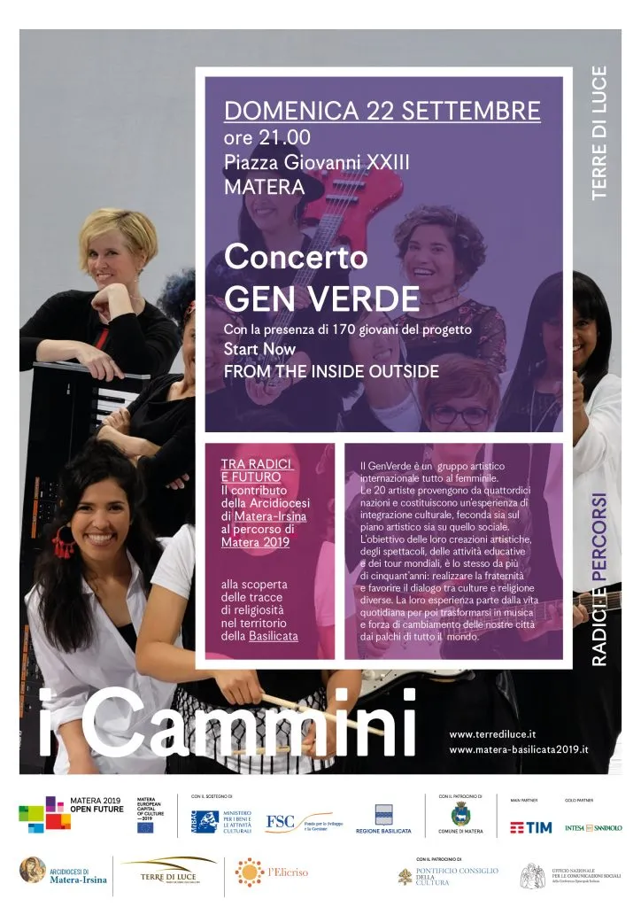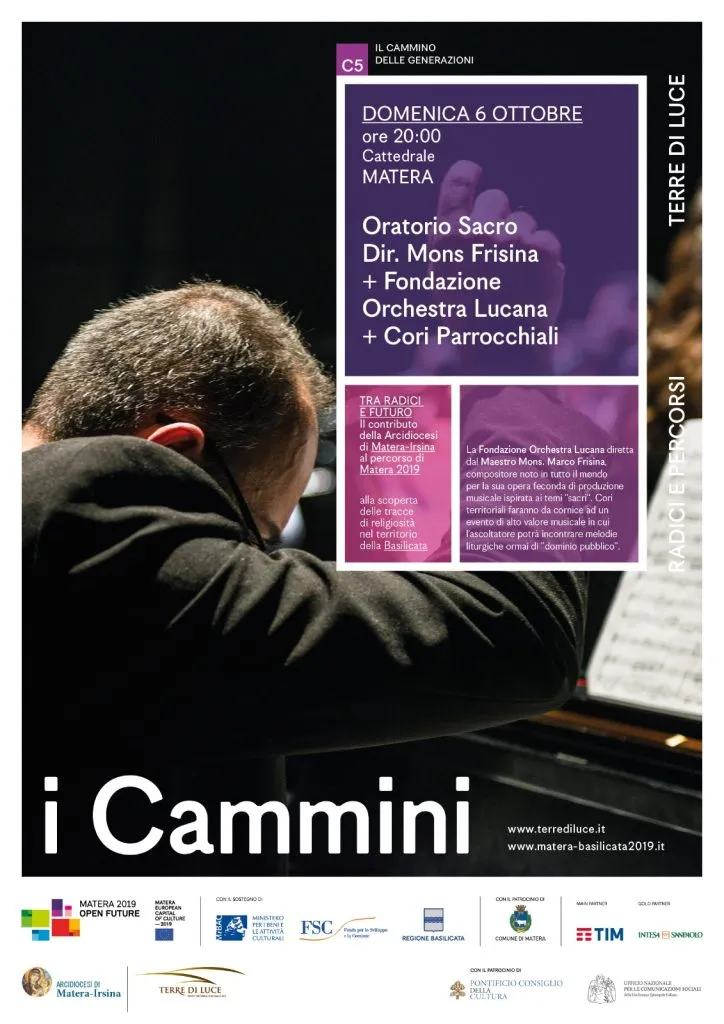 Il Progetto dell’Arcidiocesi Matera-Irsina, messo a punto dalla predetta Associazione Terre di luce e denominato “I Cammini”, metteva insieme 115 eventi che prevedevano una serie di attività culturali, musicali e religiose che si sviluppavano su percorsi da effettuare in luoghi sacri reali e virtuali, attraversando la cultura antropologica e rivisitando la tradizione e la devozione lucana.