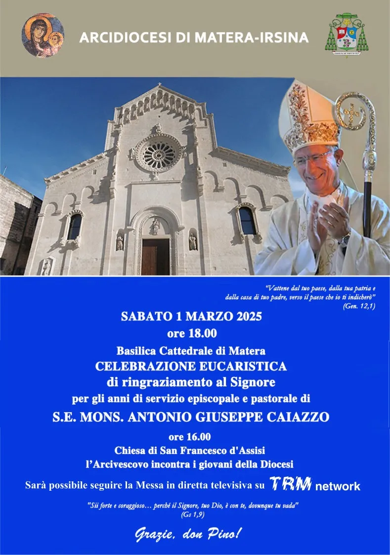 L’Arcidiocesi di Matera-Irsina e quella di Tricarico saluteranno Mons. Antonio Giuseppe Caiazzo, neoeletto Vescovo di Cesena-Sarsina, con una celebrazione eucaristica di ringraziamento per gli anni del suo servizio pastorale che si svolgerà venerdì 28 marzo 2025 alle ore 18.00 nella Cattedrale di Tricarico e sabato 1° marzo 2025 alle ore 18.00 nella Cattedrale di Matera.