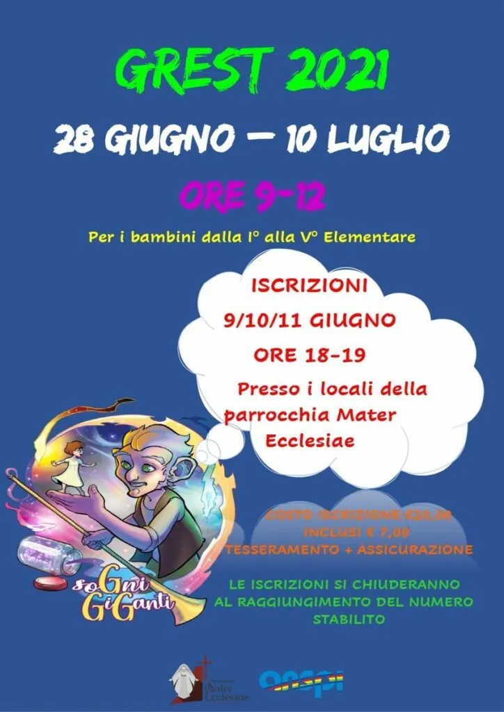 Si accettando iscrizioni il 9 – 10 – 11 giugno dalle 18.00 alle 19.00. Lo scopo è quello di vivere insieme ai ragazzi un percorso fatto di giochi, attività, preghiera, divertimento e amicizia scoprendo la bellezza di fare SOGNI GIGANTI!