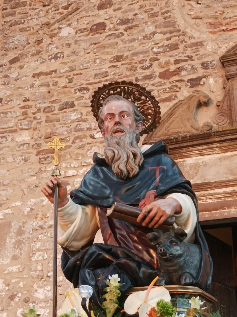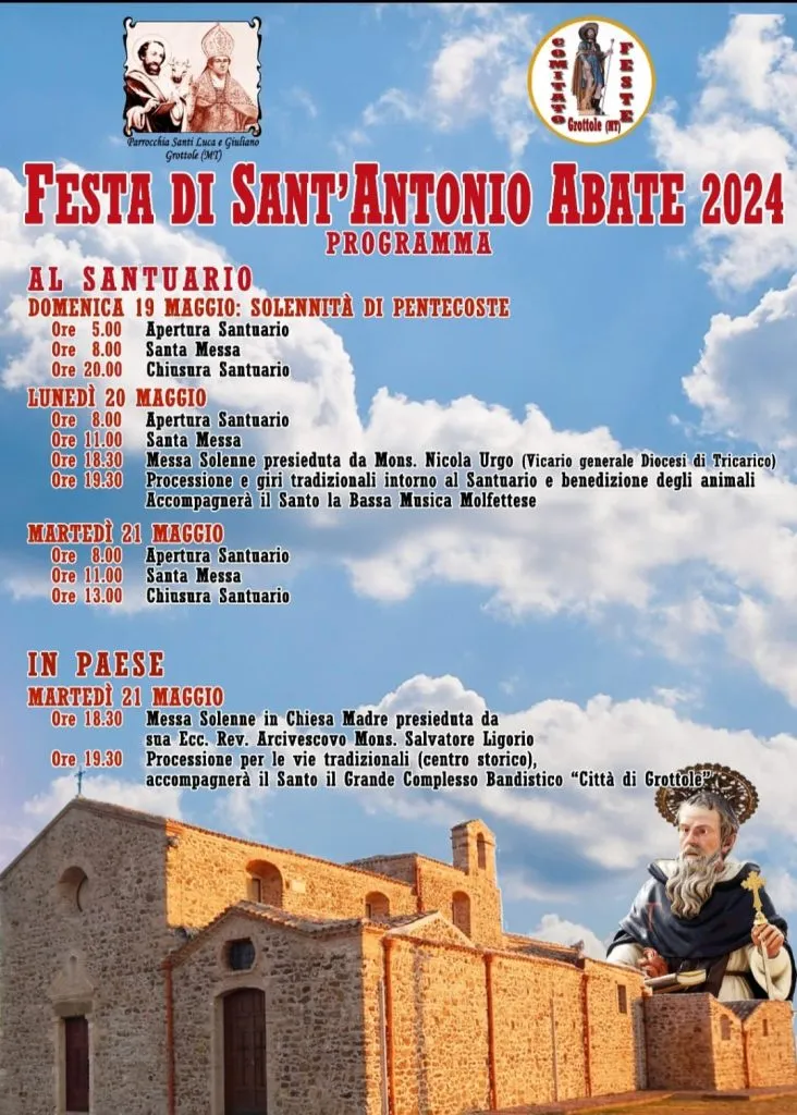 È tuttora grande la devozione dei grottolesi per S. Antonio Abate (Tebaide, 251-360 d.C.), uno dei primi asceti della storia della Chiesa, il fondatore del monachesimo, stimato grande consigliere e pertanto detto anche “Magno”, invocato come protettore contro gli assalti satanici e le eresie (tanto diffuse ai suoi tempi: ricordiamo l’arianesimo e, di conseguenza, il concilio di Nicea), associato alla protezione degli animali domestici, essendo immaginato da essi circondato, in particolare dal porcellino “Antonino”, nel deserto.