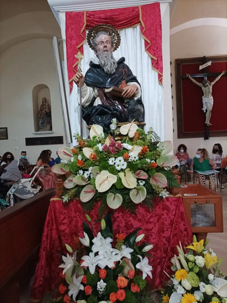 In paese, custodita nella chiesa di S. Pietro, vi è una bella statua lignea di scuola napoletana del santo eremita, robusta ed espressiva nello sguardo, che fece realizzare nel 1891 la devota e abbiente famiglia grottolese Danzi, a vantaggio di chi, per salute ed età, non sarebbe potuto andare ad Altojanni. La statua viene portata prima del solenne pontificale del martedì sera in Chiesa Madre, che quest’anno officerà Mons. Salvatore Ligorio, già vescovo di Matera-Irsina, e dopo la celebrazione eucaristica, svolge il giro del centro storico accompagnata dalla banda.