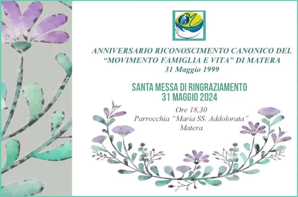 Il “Movimento Famiglia e Vita” di Matera, Associazione Ecclesiale riconosciuta a livello diocesano dal 1999, persegue finalità di solidarietà sociale erogando servizi in modo continuativo, attivo e diretto, in sostegno delle famiglie, con l’obiettivo di prevenire e rimuovere ogni disagio nella sua dimensione spirituale, morale e materiale. Scopo principale dell’Associazione è la promozione della cultura della famiglia, quale cellula fondamentale della società, mediante attività formative e culturali a livello regionale, interregionale e nazionale. Oltre a incontri settimanali di formazione per famiglie, tra le attività del Movimento, ci sono percorsi formativi specifici sia per fidanzati finalizzati all’educazione all’amore, alla preparazione al matrimonio e al coinvolgimento degli stessi in un’esperienza permanente di approfondimento della fede, sia per persone che vivono situazioni familiari difficili (separazione, divorzio..).