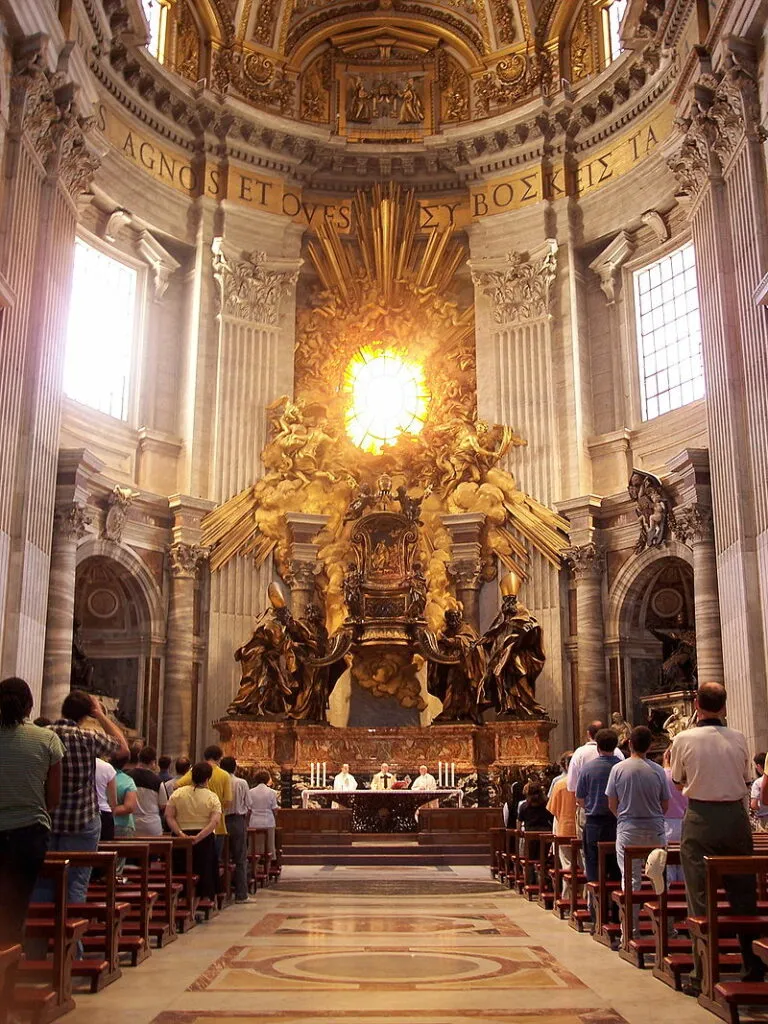 La Cattedra di S. Pietro – raffigurante su una placca d’oro l’episodio “Pasci le mie pecorelle” e ai due lati la consegna delle chiavi a Pietro e la lavanda dei piedi – si trova in un’abside in fondo alla Basilica di S. Pietro, all’interno di una grandiosa composizione barocca alta sette metri: la “Gloria” progettata da Gian Lorenzo Bernini (1656 – 1665) raffigurante quattro dottori della Chiesa – S. Agostino, S. Ambrogio, S. Anastasio e S. Giovanni Crisostomo – e due angeli.