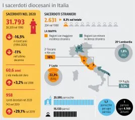 A metterli tutti insieme nello stesso posto, i sacerdoti diocesani italiani riempirebbero lo Stadio Via del Mare di Lecce. Nel 2020, infatti, il totale dei sacerdoti è pari a 31.793 unità. Erano 38.209 nel 1990: il calo, in trent’anni, è stato del 16,5% con 6.416 sacerdoti in meno ma solo negli ultimi dieci anni il clero è diminuito dell’11%. Una flessione che in parte, come evidenziato anche nell’inchiesta sui seminaristi, è stata compensata dall’ingresso in Italia di un sempre maggior numero di sacerdoti stranieri al servizio delle diocesi italiane. Nel dettaglio, un incremento di oltre dieci volte: si è passati da 204 nel 1990 a 2.631 nel 2020. Rispetto alla popolazione generale, se nel 2000 solo il 3,4% dei preti era straniero, nel 2010 la percentuale è salita al 6,6% e nel 2020 è arrivata all’8,3%. Tra i soli sacerdoti italiani, dunque, si è registrato un calo del 19,8% (da 36.350 unità nel 2000 a 29.162 nel 2020) mentre i sacerdoti stranieri rappresentano oggi l’8,3% del totale.