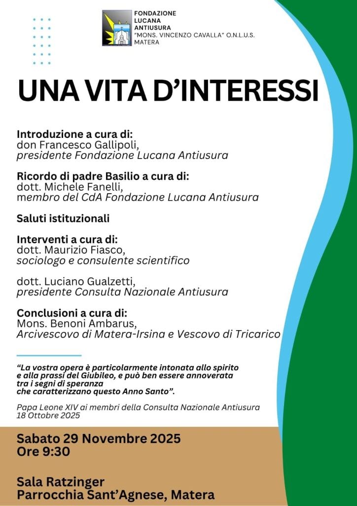 Per il prossimo 29 novembre, la Fondazione Mons. Vincenzo Cavalla, ha organizzato un Convegno per ripercorrere il cammino e la storia della Fondazione, e per sottolineare l’impegno di tutte le Fondazioni e le Associazioni presenti sul territorio nazionale per dare risposte concrete al bisogno di tanti, ricattati e minacciati dall’usura. Essere presenti numerosi al Convegno che si terrà dalle ore 9:30 alle 12:00, presso la Sala Ratzinger della Parrocchia di Sant’Agnese a Matera, rappresenterà un forte segnale per isolare il fenomeno e i criminali che approfittano dei momenti di debolezza e di fragilità di famiglie e imprese.