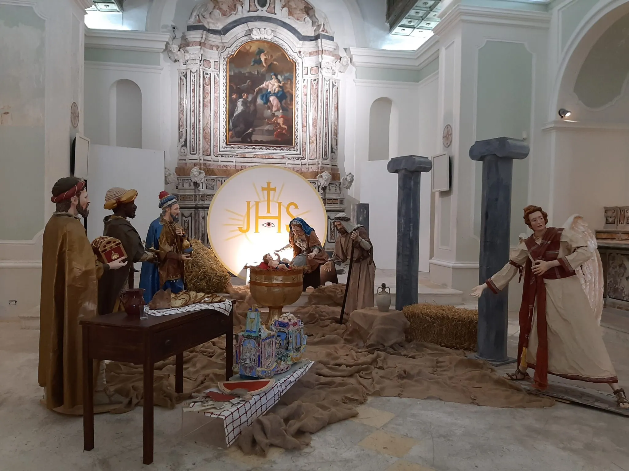 Al centro della chiesa sono ospitati i piccoli presepi realizzati dai bambini che hanno frequentato il laboratorio di cartapesta curato dall’Associazione Legoratio mentre quello firmato da Sansone è di proprietà dell’Associazione.