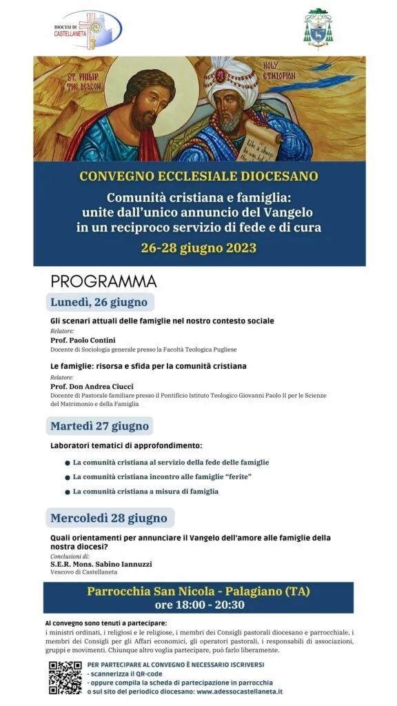 Dal 26 al 28 giugno a Palagiano, presso la Parrocchia San Nicola (dalle ore 18 alle 20,30), si terrà il Convegno ecclesiale della Diocesi di Castellaneta che avvia il triennio pastorale dedicato alla famiglia. Di seguito riportiamo il testo integrale del comunicato stampa pervenuto.