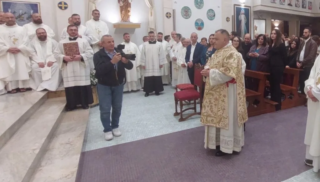 Intensi anche i momenti in cui la moglie di Giuseppe ha portato sul presbiterio la stola e la dalmatica, i paramenti liturgici diaconali, che Giuseppe ha indossato aiutato dall’amico, ora confratello, diacono Terenzio Cucaro e dal parroco don Marco di Lucca, suggellato questo dal canto “Servire è regnare”, a cui si è sovrapposto uno spontaneo fragoroso applauso. E, infine, l’abbraccio di pace con il vescovo e con gli altri diaconi, segno di accoglienza di Giuseppe nella fraternità diaconale, alla fine del quale si è levato un altro rumoroso applauso.