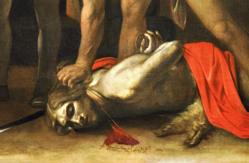 Questa l’unica opera che Caravaggio firma, in rosso: prosecuzione del sangue che sgorga dalla gola di Giovanni: “f[ra] Michelangelo”. Sì, Michelangelo Merisi, ai più noto come Caravaggio, al momento della realizzazione dell’opera era già un Cavaliere dell’Obbedienza Magistrale dell’Ordine di Malta, il più alto grado cui poteva aspirare un uomo e un artista come il Merisi, un frate.