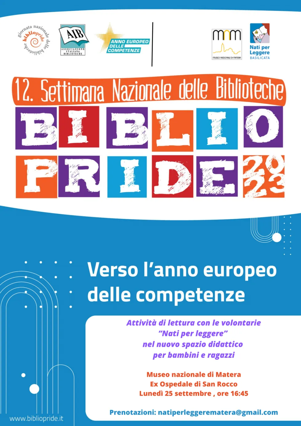 In occasione della “Settimana nazionale delle biblioteche – Bibliopride 2023” sul tema “Verso l’anno europeo delle competenze” promossa dall’AIB dal 25 settembre al 1° ottobre, il Museo apre questo spazio nella giornata di lunedì 25 settembre alle ore 16:45, proponendo attività di lettura dedicate ai bambini più piccoli a cura delle volontarie di “Nati per leggere” Basilicata.