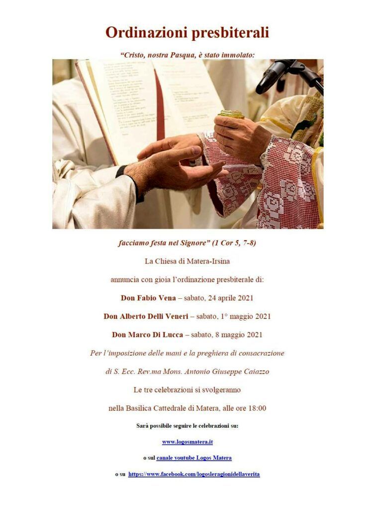 Nei prossimi giorni, nella Chiesa di Matera-Irsina, saranno ordinati tre nuovi sacerdoti: don Fabio Vena il 24 aprile, don Alberto Delli Veneri l’1 maggio e don Marco Di Lucca l’8 maggio. Tutti nella cattedrale di Matera alle ore 18,00 per imposizione delle mani e la preghiera consacratoria dell’arcivescovo mons. Antonio Giuseppe Caiazzo.