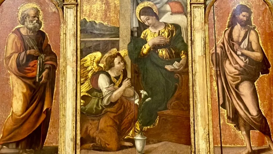 In questa regione dimostrò di non essere solo un semplice manierista o un arido replicatore di stampe. Per il tema portante del polittico salandrese, composto da nove tavole dipinte a tempera distribuite e raccordate in un’ampia cornice, andò oltre la mera pennellata con un racconto più articolato. Lui che fu notoriamente lezioso, certamente incoraggiato dai suggerimenti francescani in quanto a prescrizioni per confezionare opere d’arte, raffigurò nella scena centrale il Bambin Gesù annunciato. Il Cristo non formatosi in uterus che si proietta dall’alto a simboleggiare il concepimento di Maria ed è paradossalmente parte della rappresentazione. L’annunciato è presente nell’annunciazione di se stesso. C’è già, quando non dovrebbe ancora esserci. Una tematica controversa questa che troverà banco nel Concilio di Trento dove ne sarà proibita definitivamente la rappresentazione artistica.