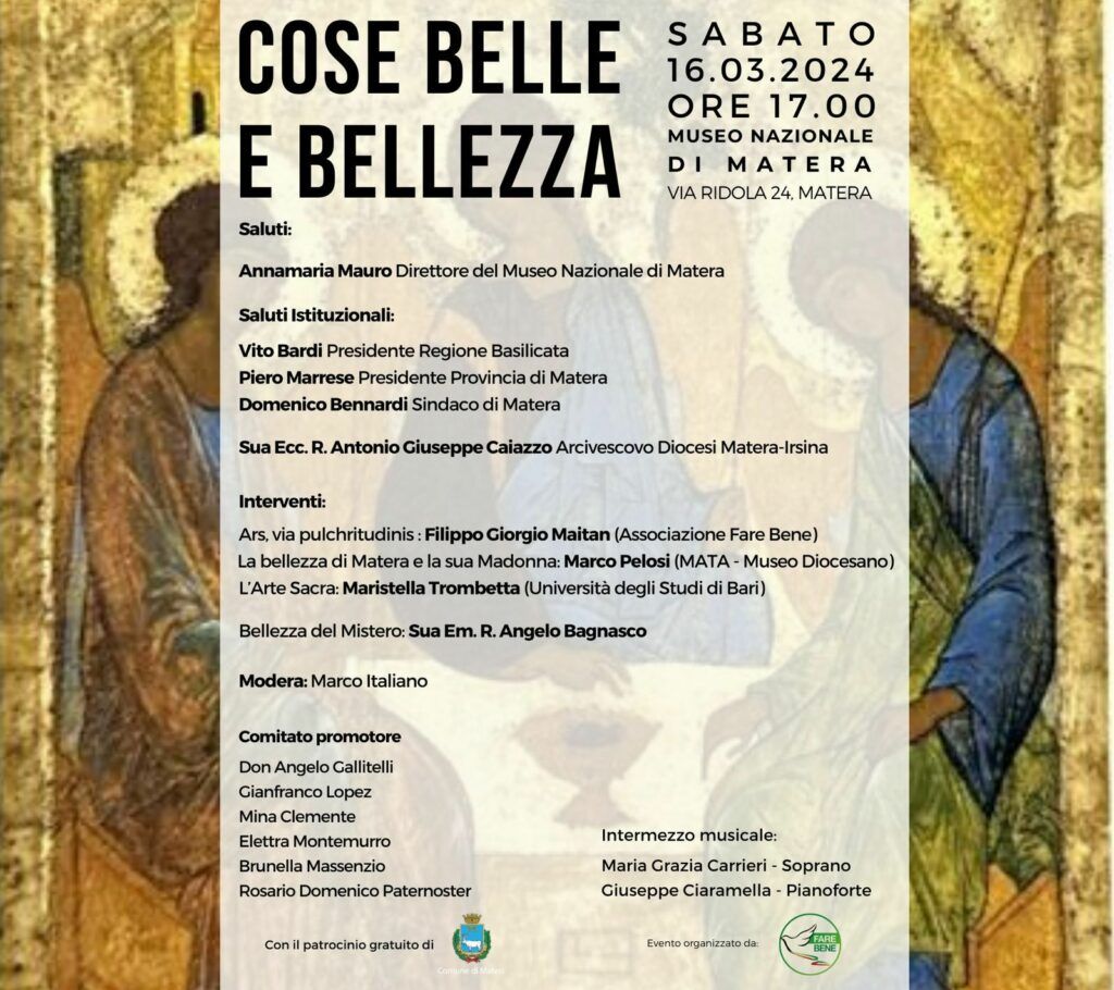 - eventi culturali, soprattutto di natura artistico-estetica: l’inaugurazione del portale ligneo nella chiesa del Purgatorio lo scorso 5 marzo. L’indomani, 06/03, una bella conferenza sull’ambone – luogo liturgico quest’anno privilegiato in relazione al tema pastorale diocesano legato al ministero della Parola – nella Parrocchia di S. Vincenzo de’ Paoli (nelle prossime settimane seguiranno altri momenti di riflessione su questo luogo liturgico nelle altre zone pastorali diocesane). “La bellezza del mistero” è il tema dell’intervento che terrà il card. Angelo Bagnasco in “Cose belle e bellezza” domani 16/03 ore 17:00 presso il Museo Ridola;