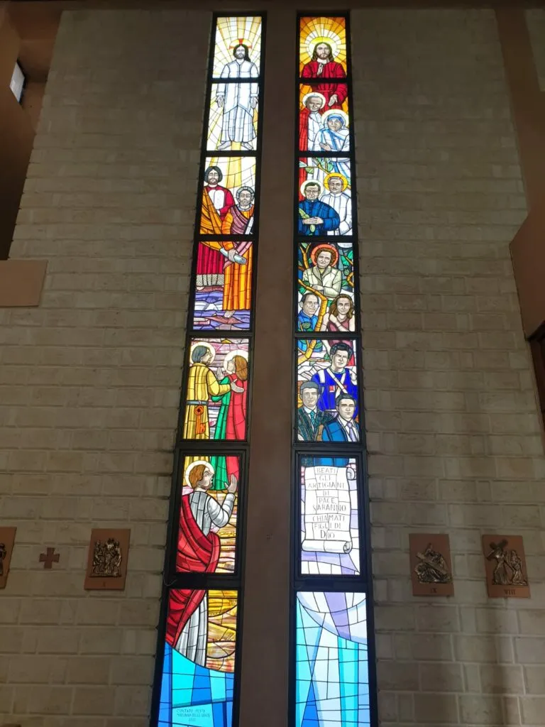 La vetrata, infatti, oltre al Maestro, Gesù, raffigura il volto di dieci Santi e Beati. Dall’alto: san Giovanni Paolo II e Santa Teresa di Calcutta, San Josè Escriva de Balaguer e san Giuseppe Moscati, Santa Gianna Beretta Molla, Beato don Pino Puglisi, Beata Chiara Luce Badano, Beato Carlo Acutis, Beato Piergiorgio Frassati, Beato Rosario Livatino.