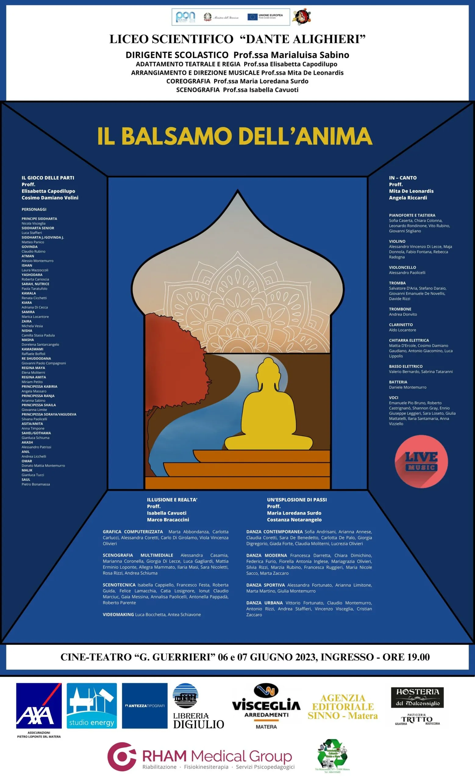 Il Liceo Scientifico “Dante Alighieri” di Matera è lieto di annunciare la messa in scena della commedia musicale “Il balsamo dell’anima “nei giorni 6 e 7 Giugno presso il Cineteatro “G. Guerrieri” di Matera alle ore 19:00. Il progetto è stato realizzato nell’ambito del PON “CULTURA, CREATIVITA’ E PROTAGONISMO”, con l’obiettivo di potenziare competenze e supportare la socializzazione tra i giovani. Sono stati coinvolti oltre cento studenti del liceo materano con un intenso percorso di preparazione. Il musical è stato realizzato con grande sinergia tra le docenti dei diversi laboratori di didattica innovativa di musica, scenografia, coreografia e recitazione.