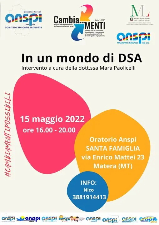 Il 15 maggio 2022 alle ore 16, presso l'oratorio Anspi Santa Famiglia di Matera, si terrà il primo degli eventi aventi per tema: "In un mondo di DSA con intervento a cura della dott.ssa Mara Paolicelli.