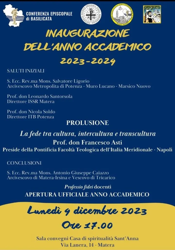 Lunedì 4 dicembre alle ore 17.00, presso l’aula Magna del centro di Spiritualità Sant’Anna, sito in via Lanera, 14, si svolgerà l’Inaugurazione congiunta dell’Anno Accademico 2023/24 dell’ISSR di Matera e dell’ITB di Potenza. La Prolusione sarà tenuta dal nuovo Preside della PFTIM, prof. don Francesco Asti, dal titolo “La fede tra cultura, intercultura e transcultura”.