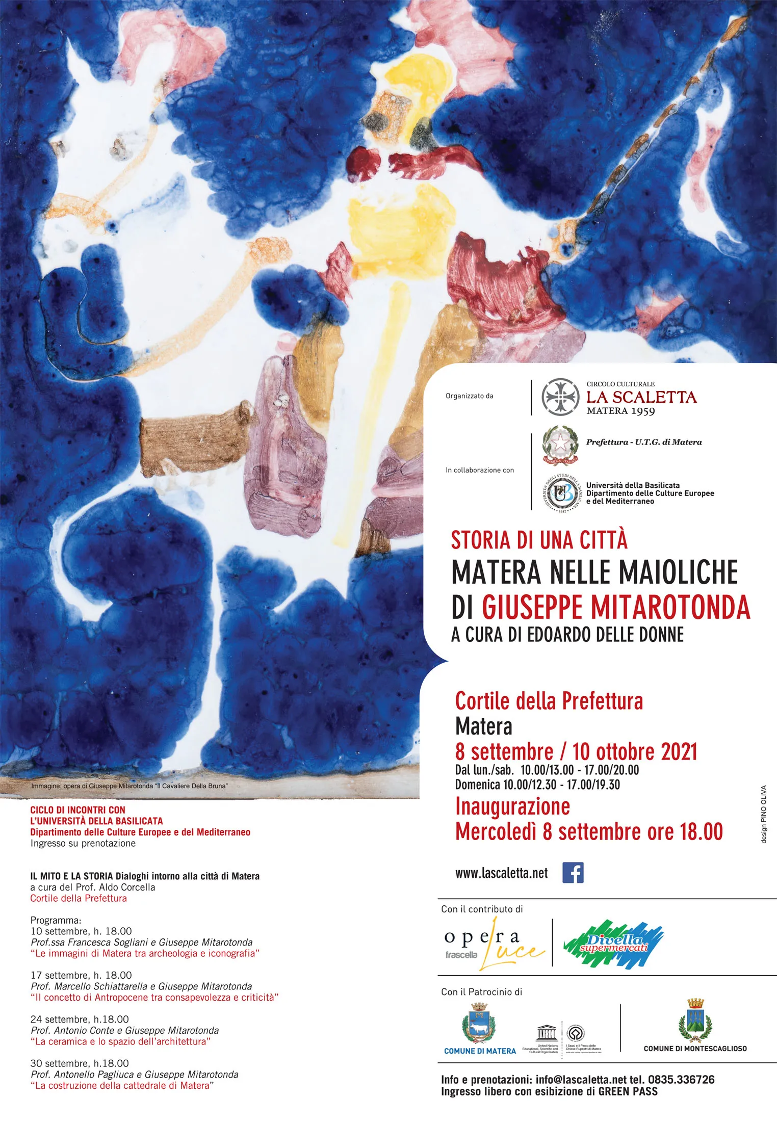 Oggi, mercoledì 8 settembre, ore 18, presso il cortile della Prefettura di Matera (Via XX Settembre, 2) sarà inaugurata la mostra, organizzata dal Circolo Culturale La Scaletta in collaborazione con la Prefettura di Matera e con il Dipartimento delle Culture europee e del Mediterraneo dell’Università della Basilicata, Storia di una città. Matera nelle maioliche di Giuseppe Mitarotonda, a cura di Edoardo Delle Donne.