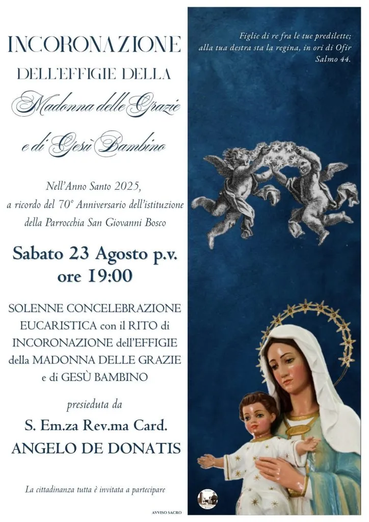 Il rito di Incoronazione avverrà sabato 23 agosto 2025 alle ore 19:00, durante la Santa Messa solenne che sarà presieduta da Sua Eminenza Reverendissima il Cardinale Angelo De Donatis, Penitenziere Maggiore.