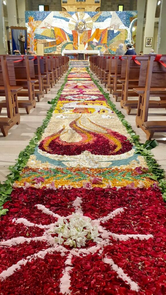 Questo atto di devozione popolare, che si ripete da anni in diversi paesi lucani (particolarmente curata l’infiorata realizzata dalla comunità di Bella nel Potentino), giunge a Matera per iniziativa del parroco della Chiesa Cristo Re Padre Carlo Basile, membro della comunità francescana dei Frati Minori che vivono e si prendono cura da poco meno di un anno, su mandato del Vescovo, del Santuario della Madonna della Palomba.