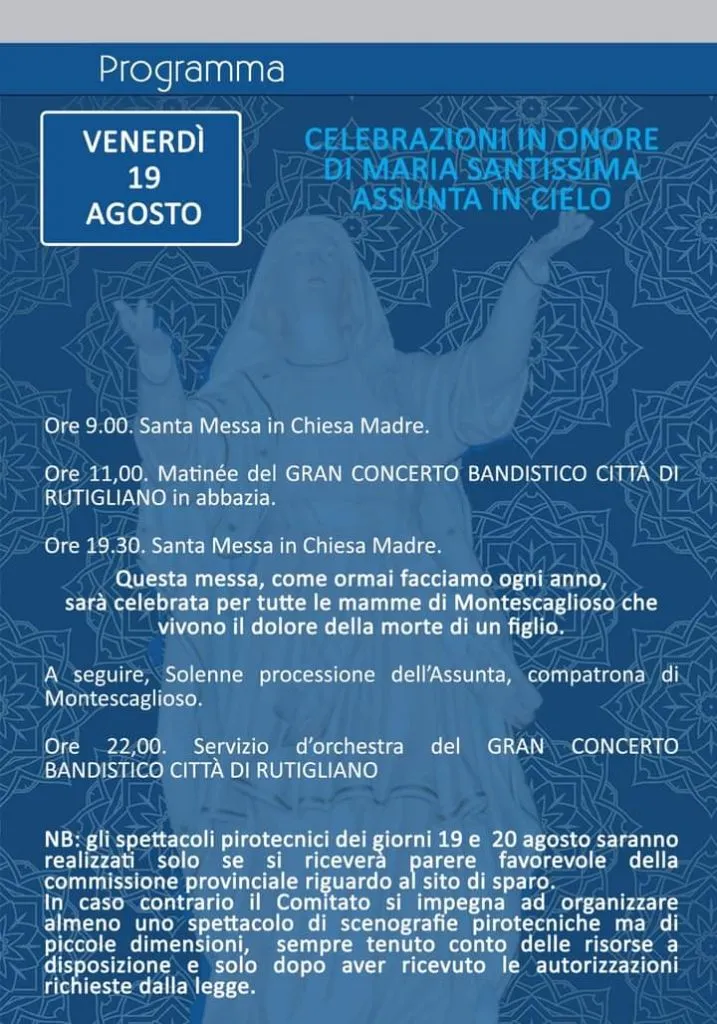 I due parroci della comunità montese, don Gabriele Chiruzzi (Parroco della Chiesa Madre) e don Mark Antony Stanislaus (Parroco di Santa Lucia), hanno rivolto un messaggio ai montesi, nel quale hanno messo a fuoco quelli che sono i valori in gioco nella nostra festa, ripresa dopo due anni di limitazioni quasi totali.