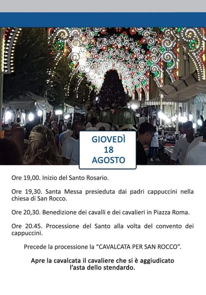 Ore 18,00 – Traslazione della statua di San Rocco “del carro” dalla Chiesa di Santa Lucia al sagrato della Chiesa di San Rocco