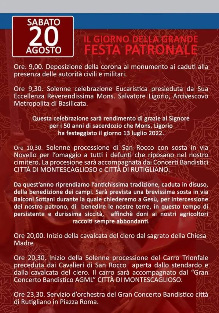 Anche il Sindaco della Città di Montescaglioso, Vincenzo Zito, nel suo saluto ai concittadini, esprime il suo augurio “affinché questi giorni possano essere per tutti noi un momento di riflessione e di riscoperta dei nostri valori e delle nostre tradizioni. La riflessione, poi, non può non prescindere da quanto vissuto in questi anni: il ricordo, in particolare, è rivolto a tutti quei familiari, amici, conoscenti che non ci sono più. Ora, però, è giunto anche il momento di ripartire, di lasciarci alle spalle tutto ciò che ci rattrista e, sotto la guida amorevole di San Rocco, celebrare al meglio queste festività”.