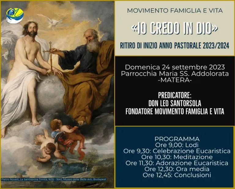 Don Leo Santorsola, fondatore del Movimento Famiglia e Vita, terrà, presso la Parrocchia dell'Addolorata in Matera, un ritiro spirituale domenica 24 settembre.