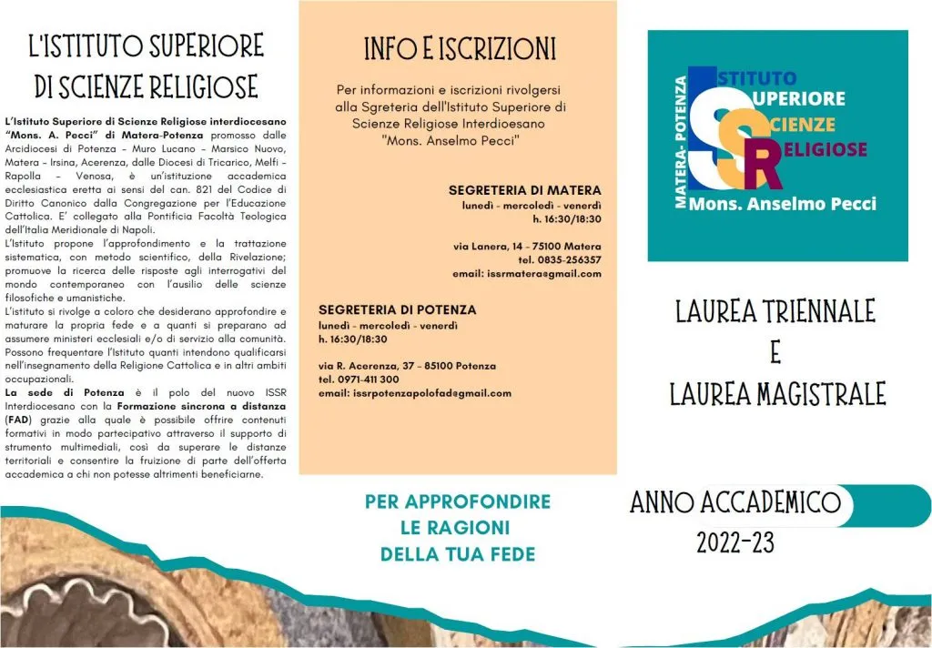 L’Istituto Superiore di Scienze Religiose interdiocesano “Mons. A. Pecci” di Matera con sede FAD a Potenza, promosso dalle tutte le diocesi della Basilicata, è un’istituzione accademica ecclesiastica eretta dalla Congregazione per l’Educazione Cattolica. E’ collegata alla Pontificia Facoltà Teologica dell’Italia Meridionale di Napoli.